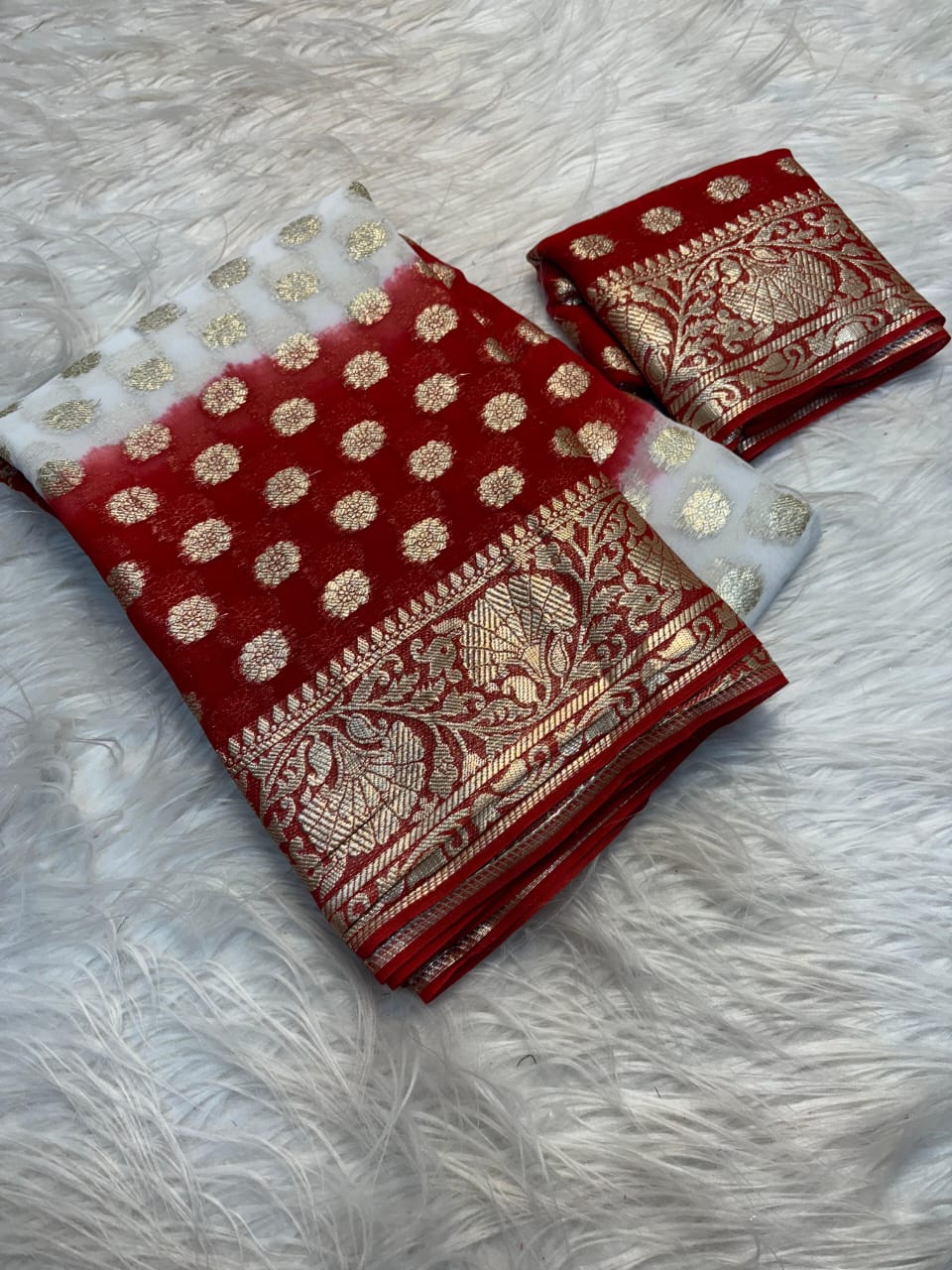 - This saree features a pure viscose jacquard border complemented by a vibrant red pallu, paired with a matching red blouse for a cohesive and elegant look.