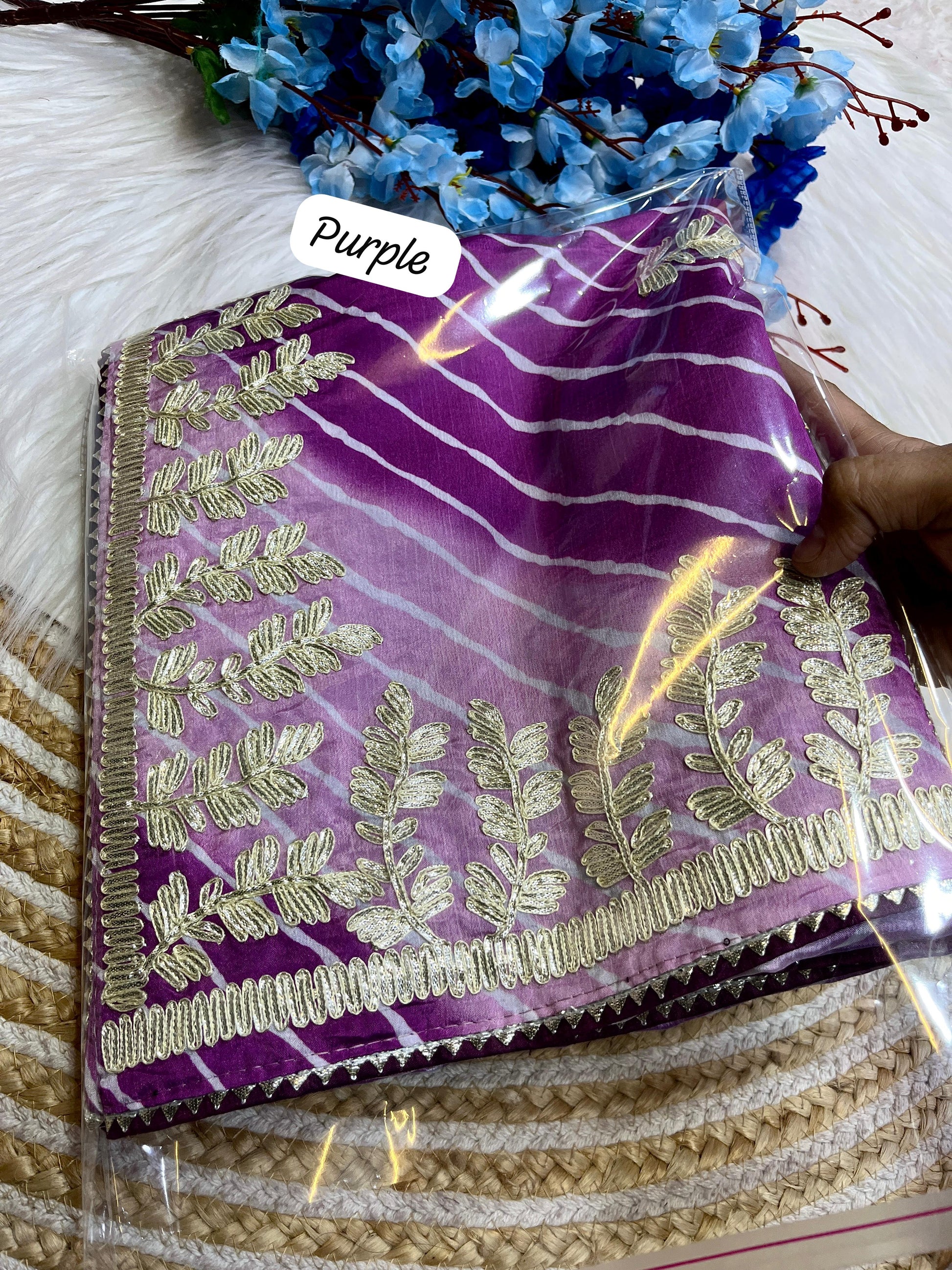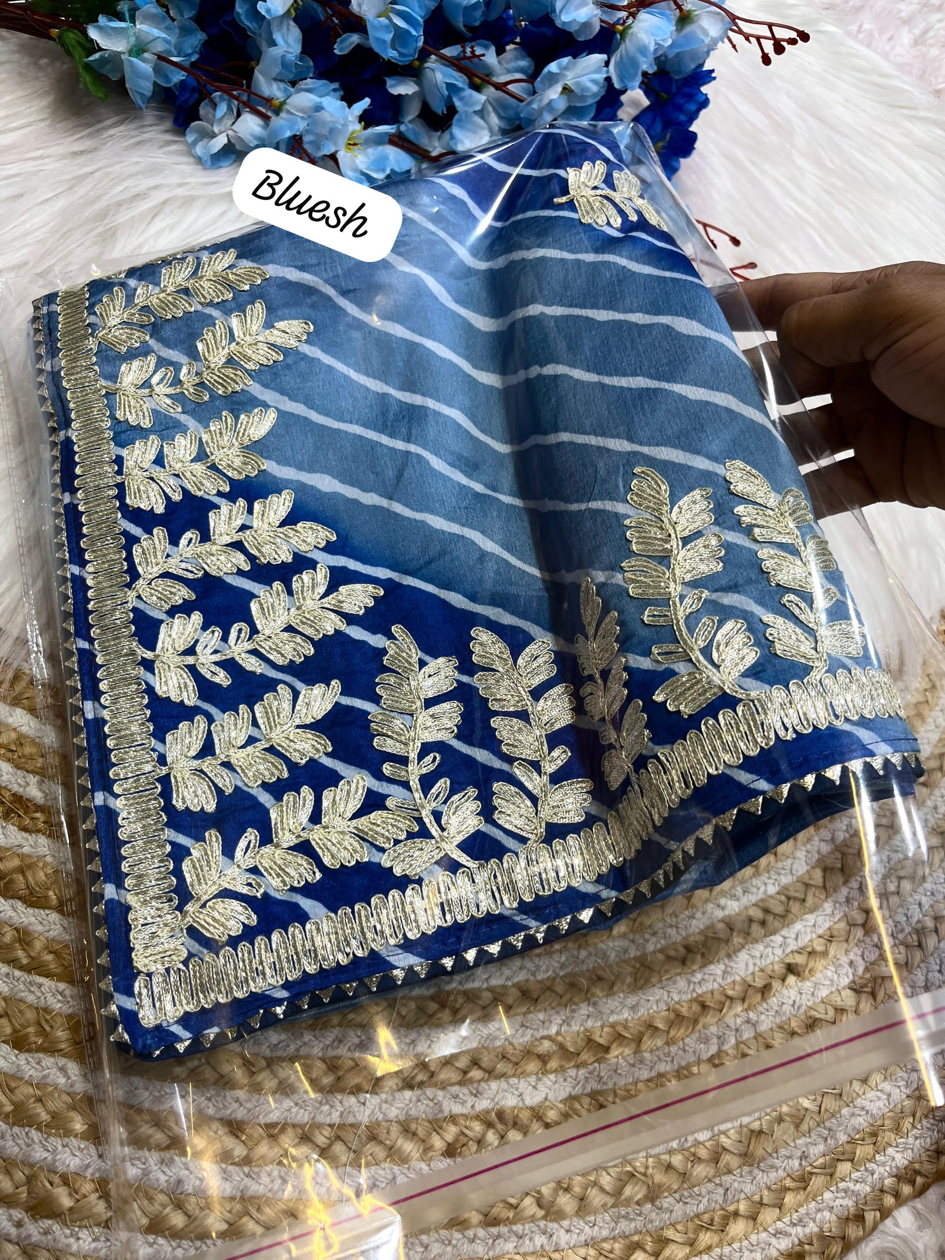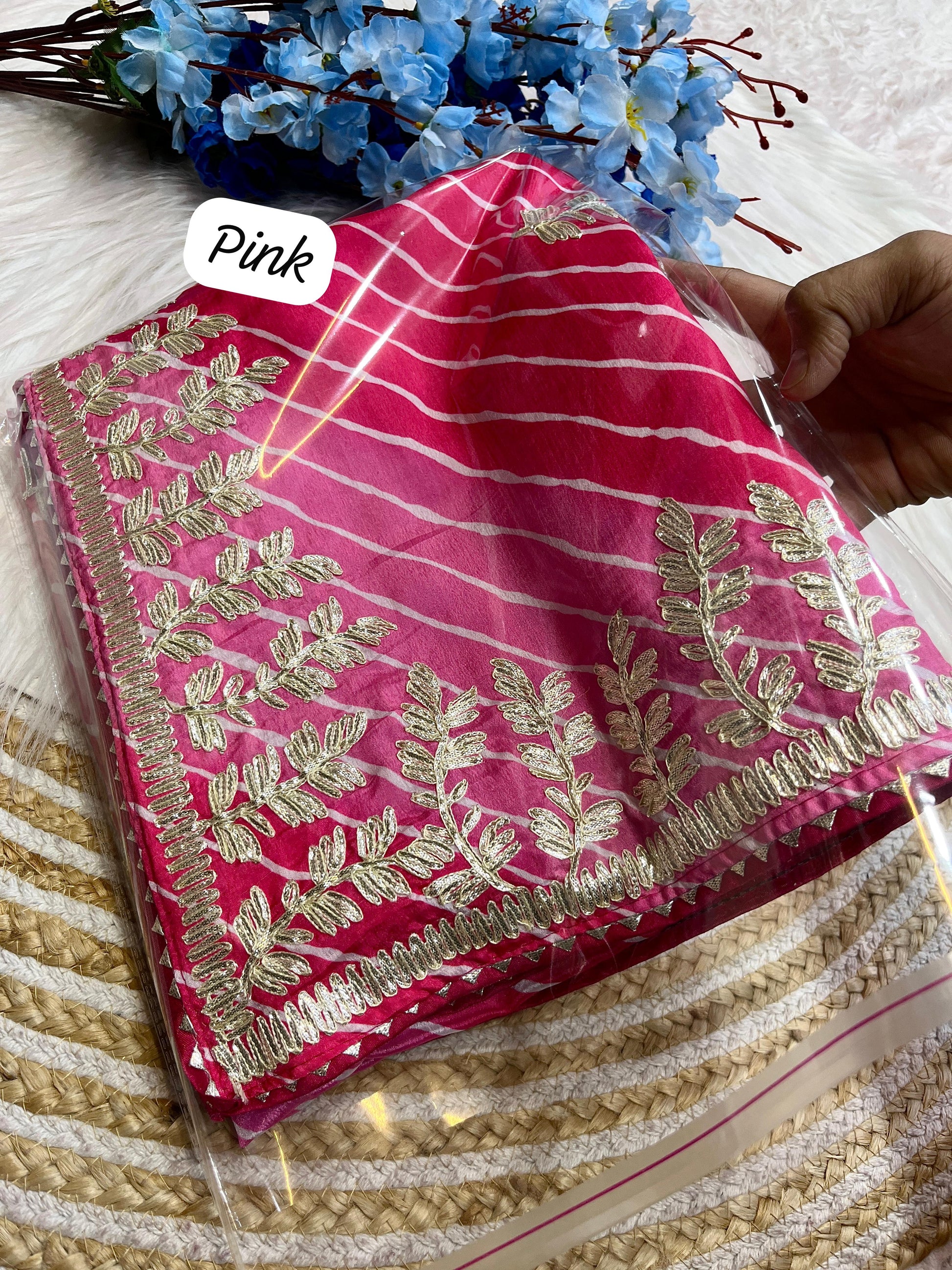 - Fabric & details :- beautiful soft chinon silk lehriya multi saree with heavy cpallu ribbon gota work nd buti in whole saree
