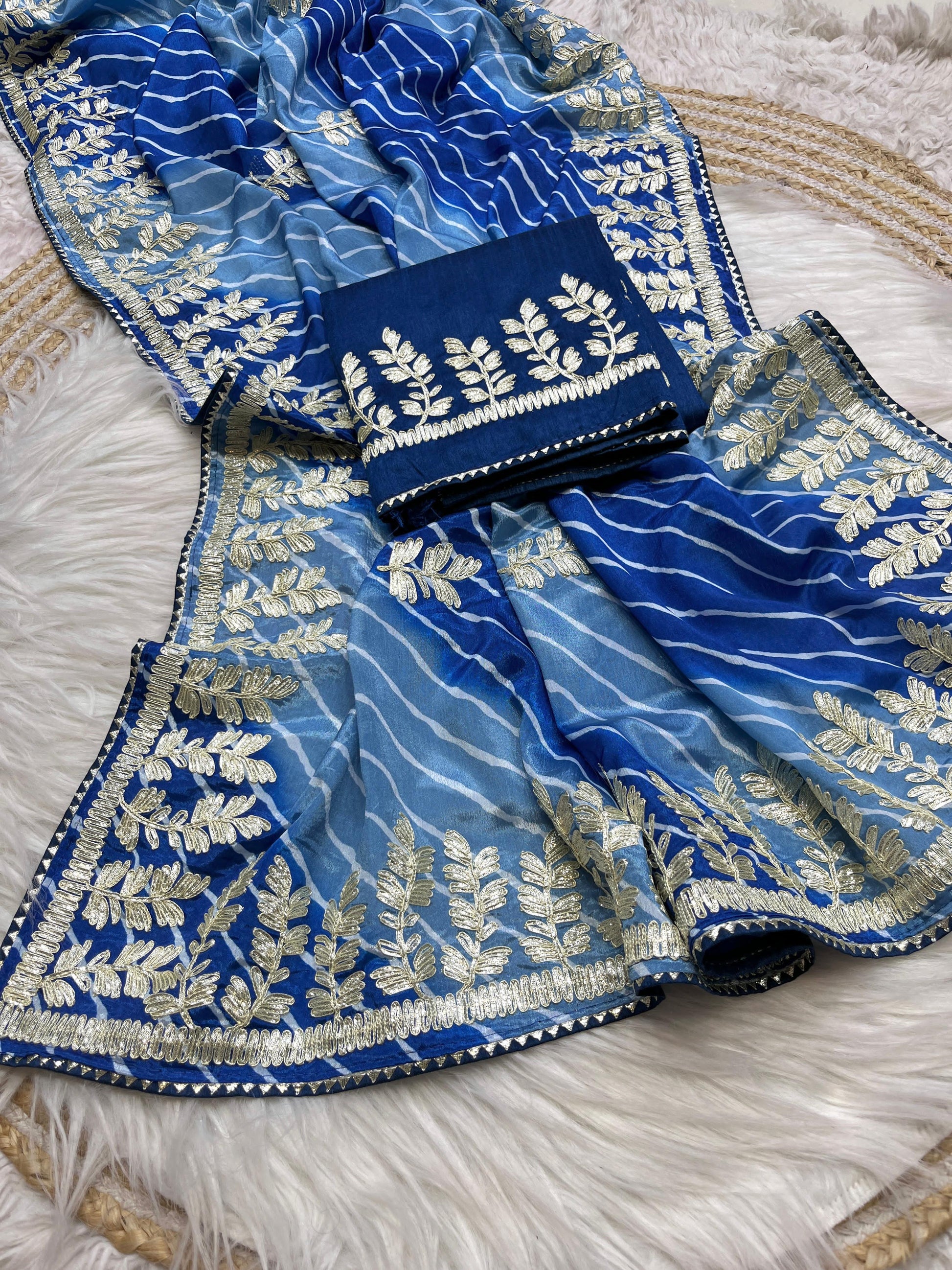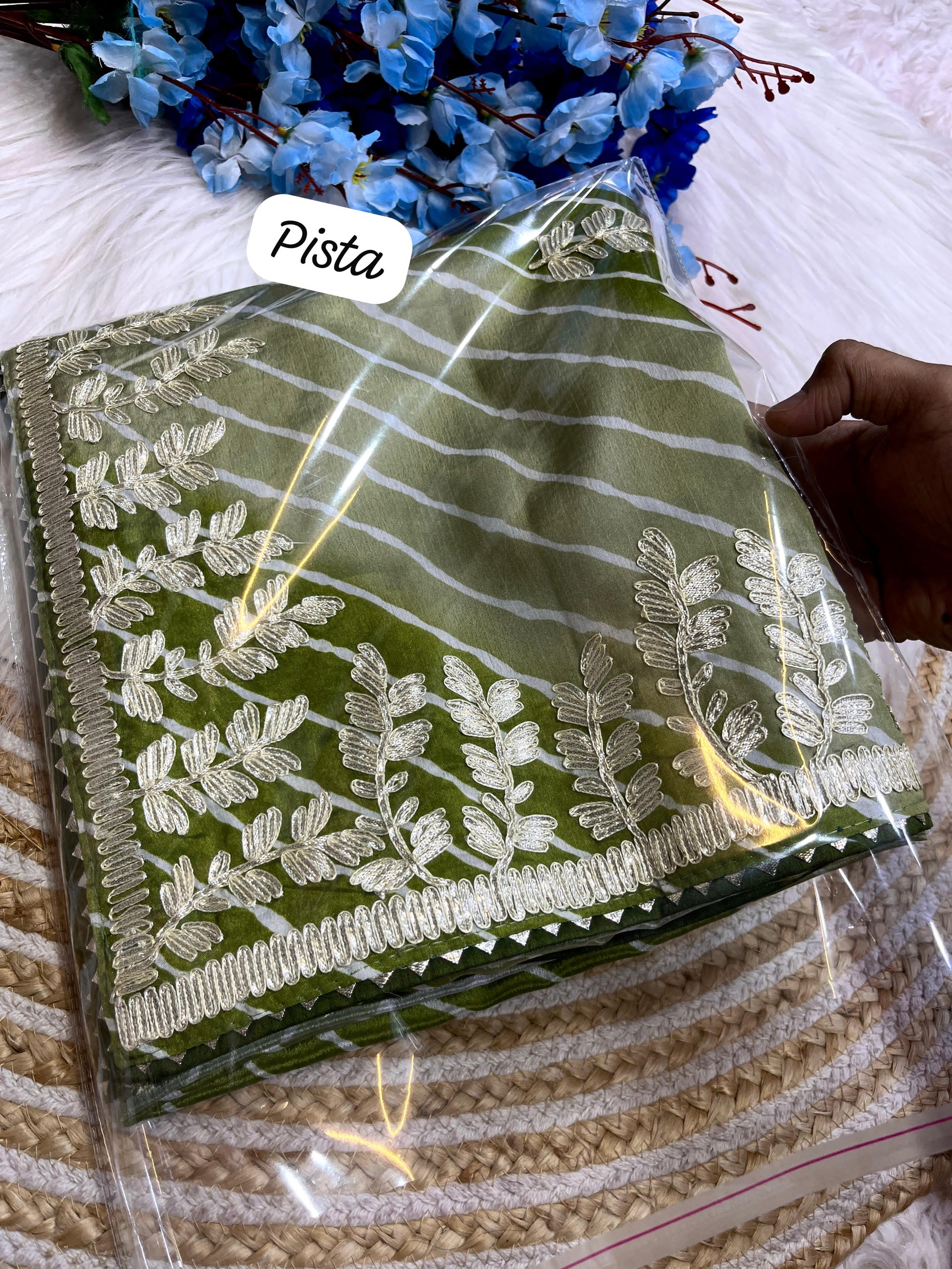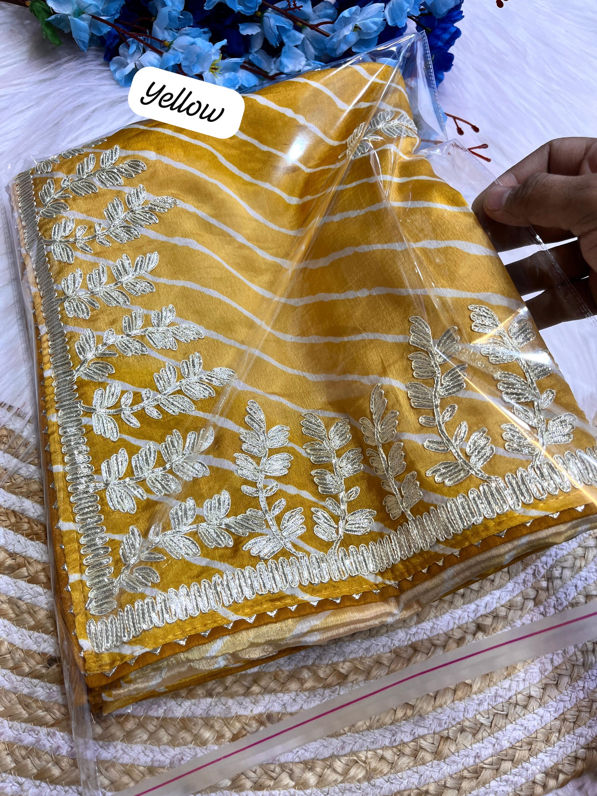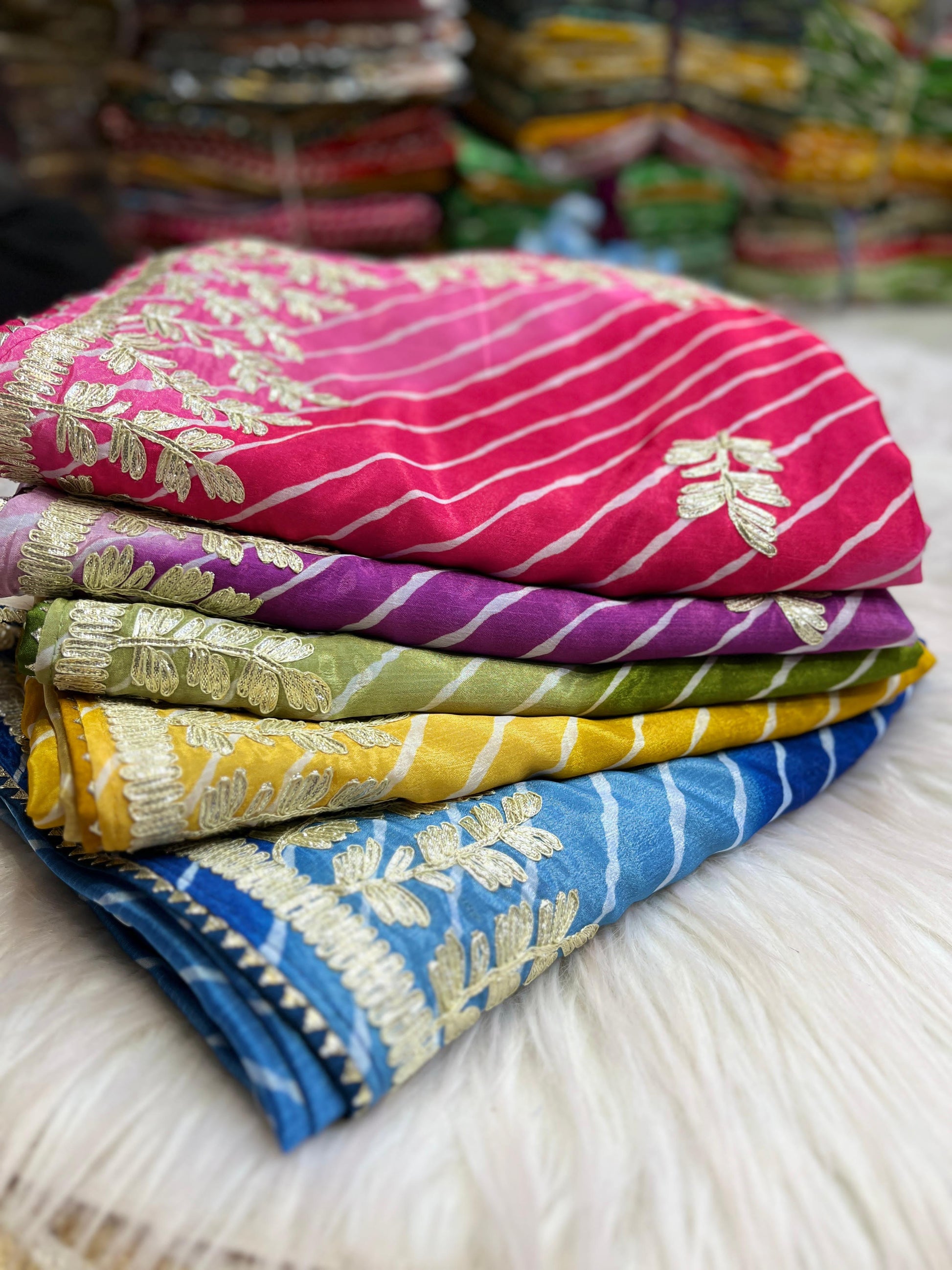 - Fabric & details :- beautiful soft chinon silk lehriya multi saree with heavy cpallu ribbon gota work nd buti in whole saree