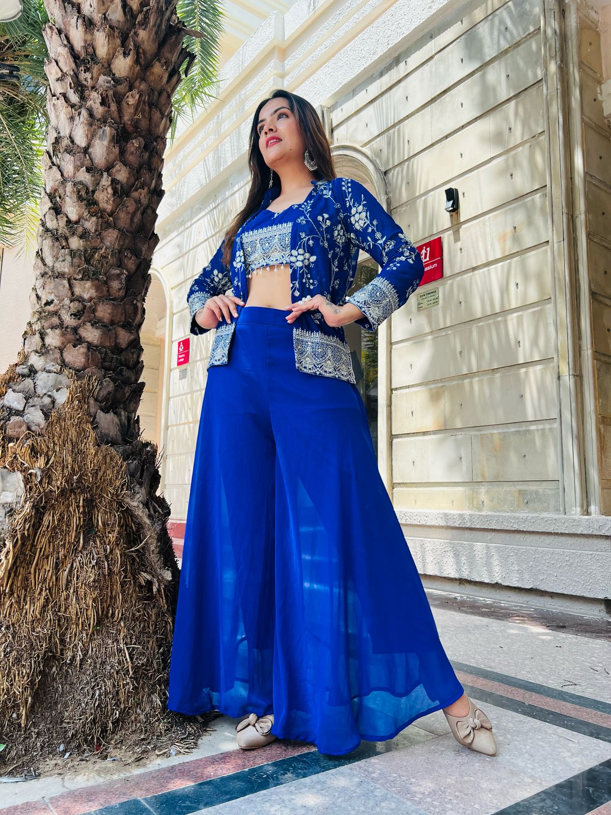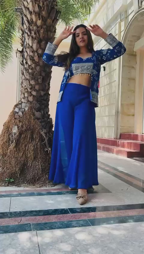 - This vibrant and designer three-piece palazzo set is crafted in royal blue, radiating elegance.