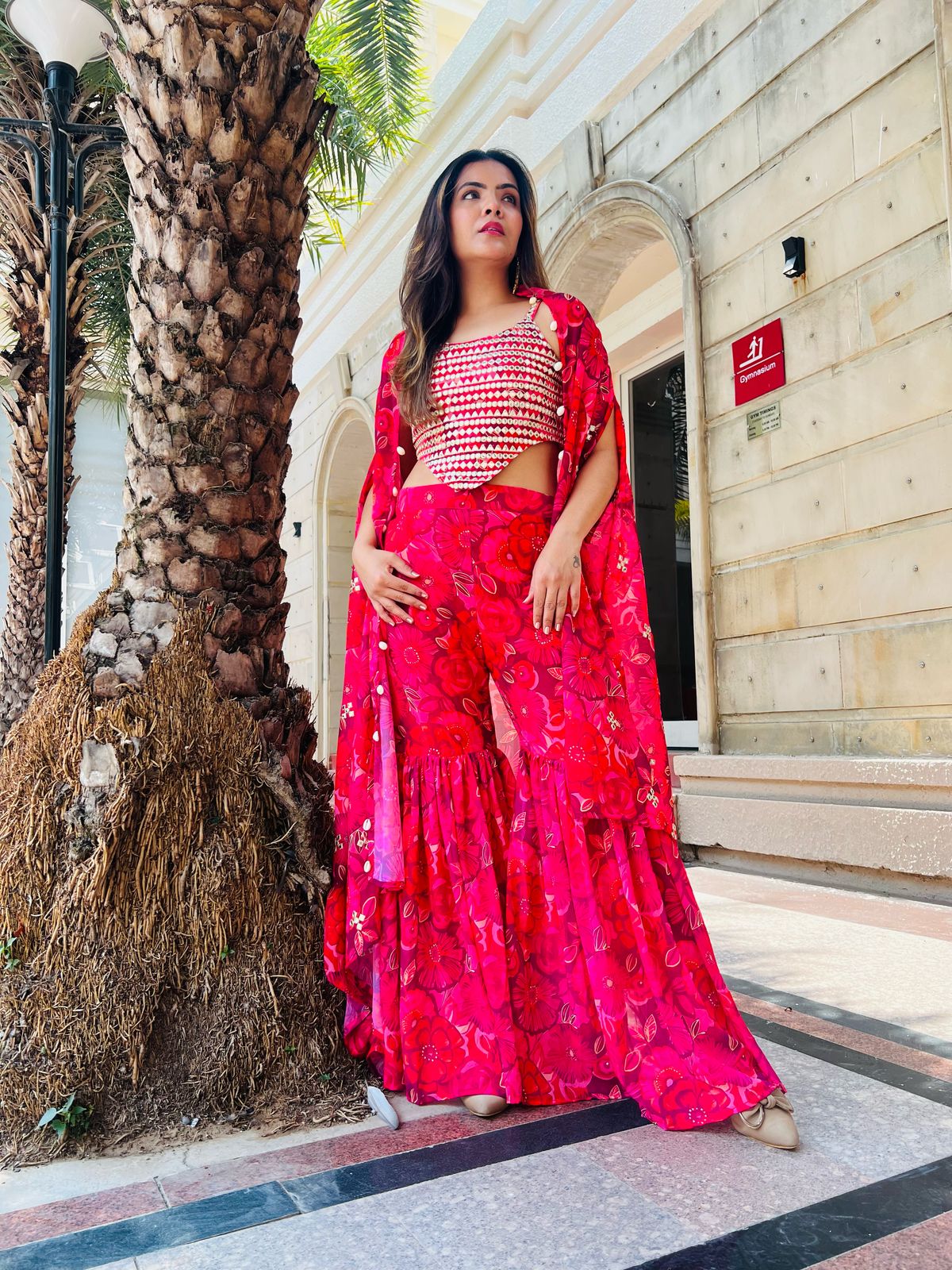 - 3pcs Garara cape set, embellished with zari, mirror work and cowri shell hangings