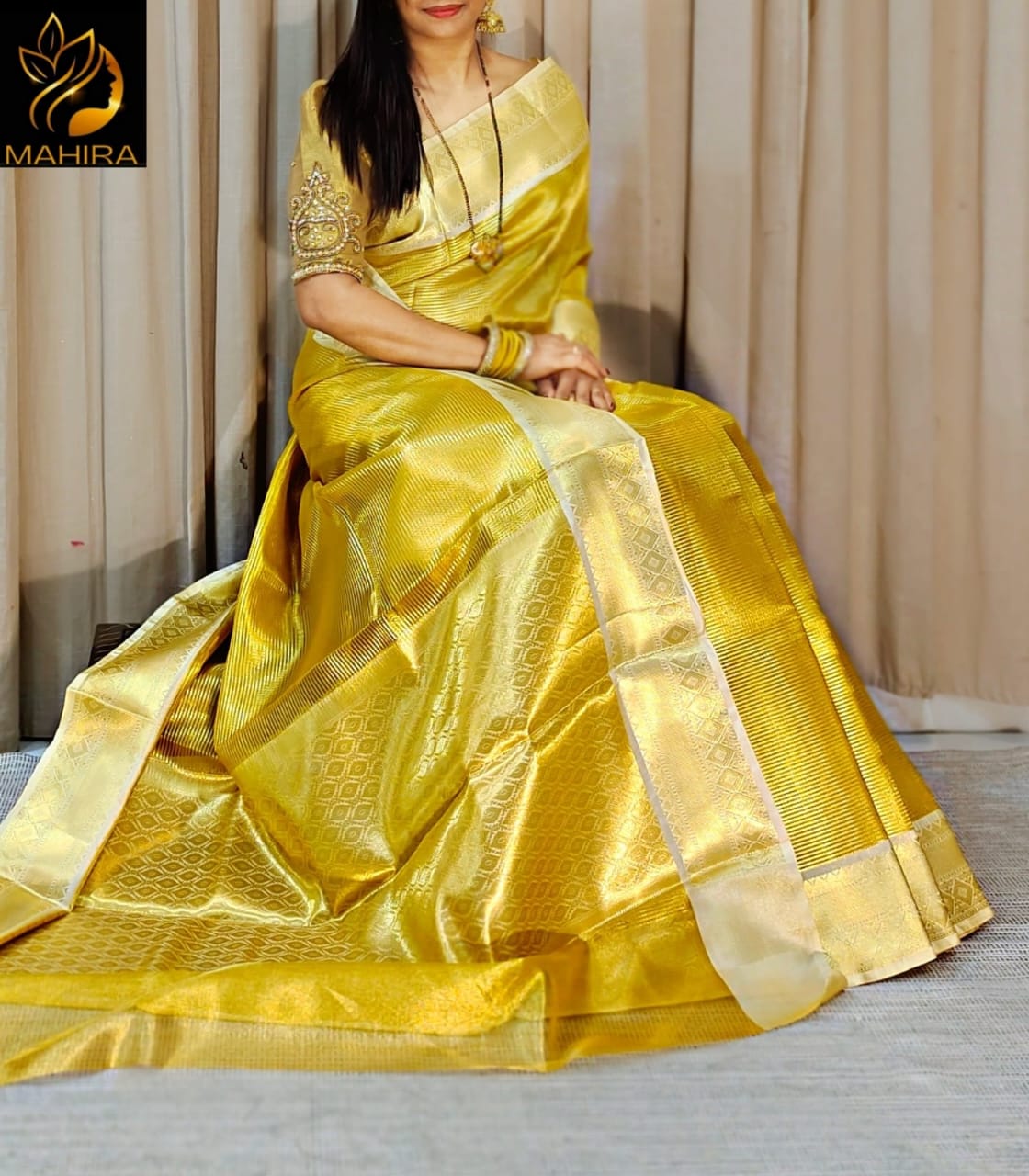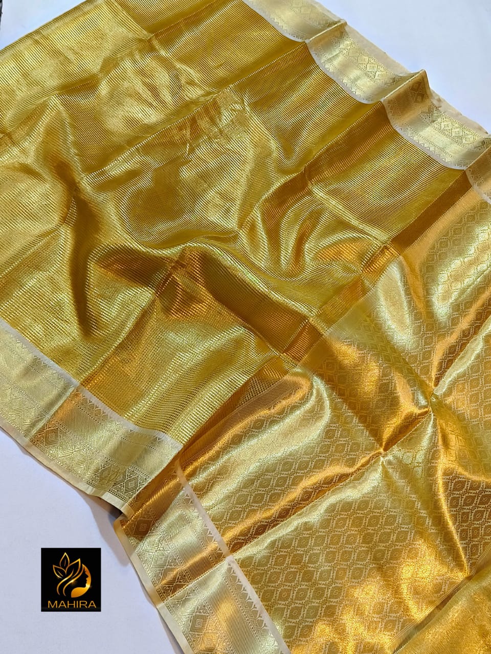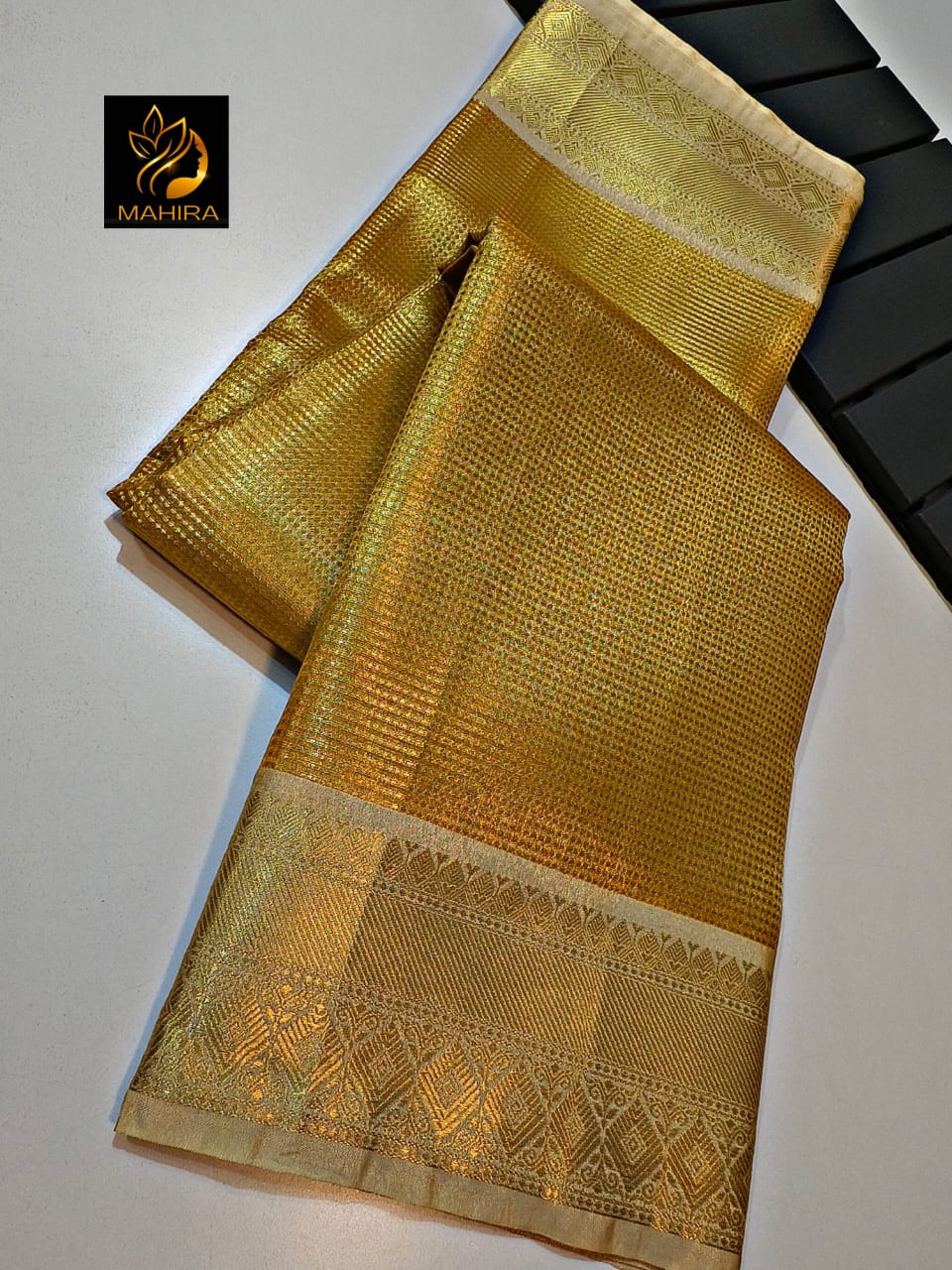- This exquisite golden bridal tissue silk saree features intricate horizontal weaving throughout, complemented by a finely woven border.
