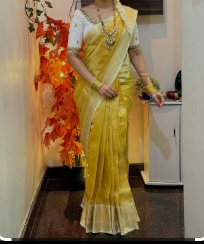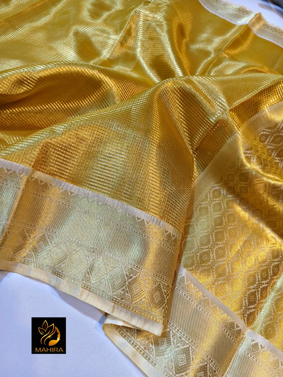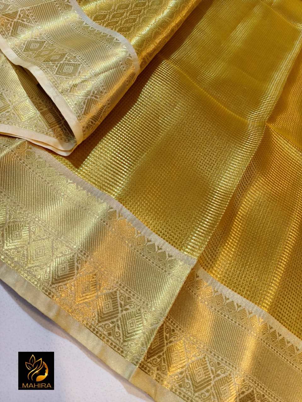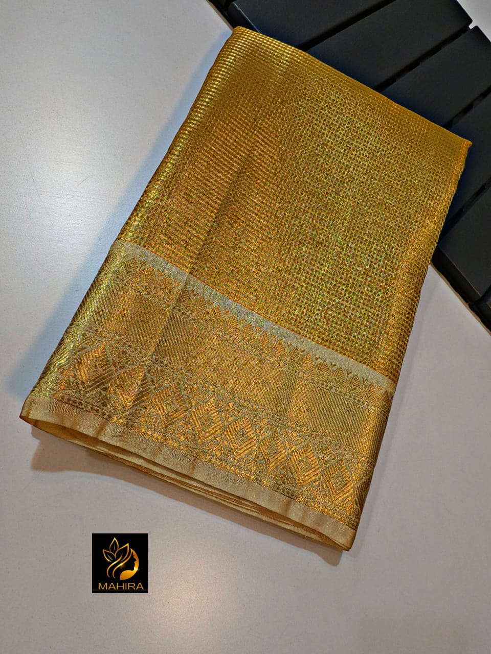- This exquisite golden bridal tissue silk saree features intricate horizontal weaving throughout, complemented by a finely woven border.
