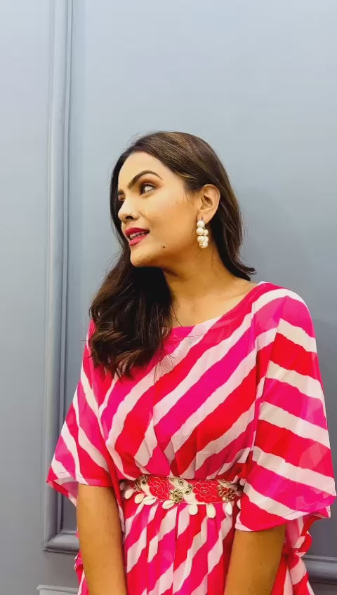 - Gorgeous Leheria kaftan and pant co-ord set with designer ethnic belt embellished with zari and resham work and kaudi hangings