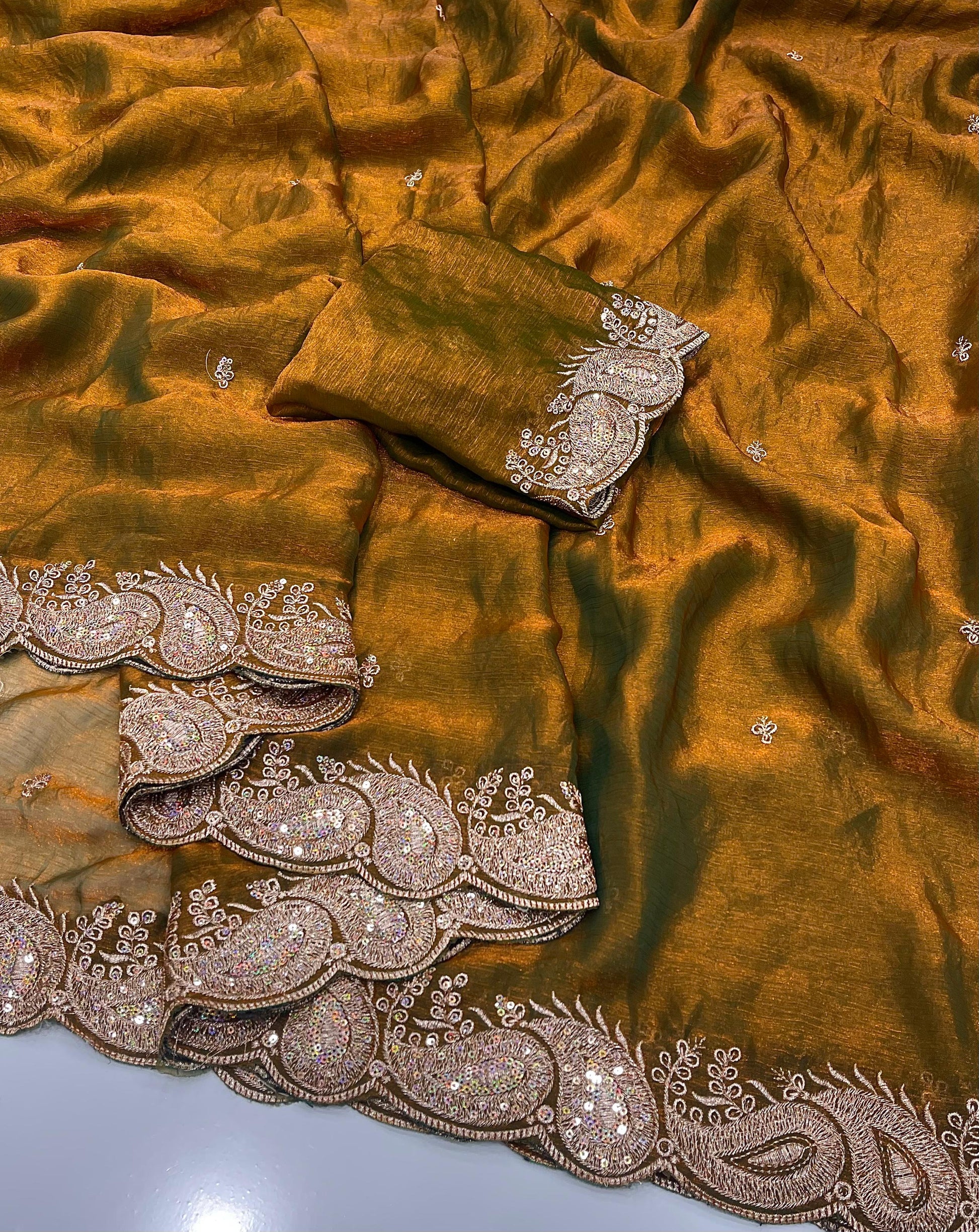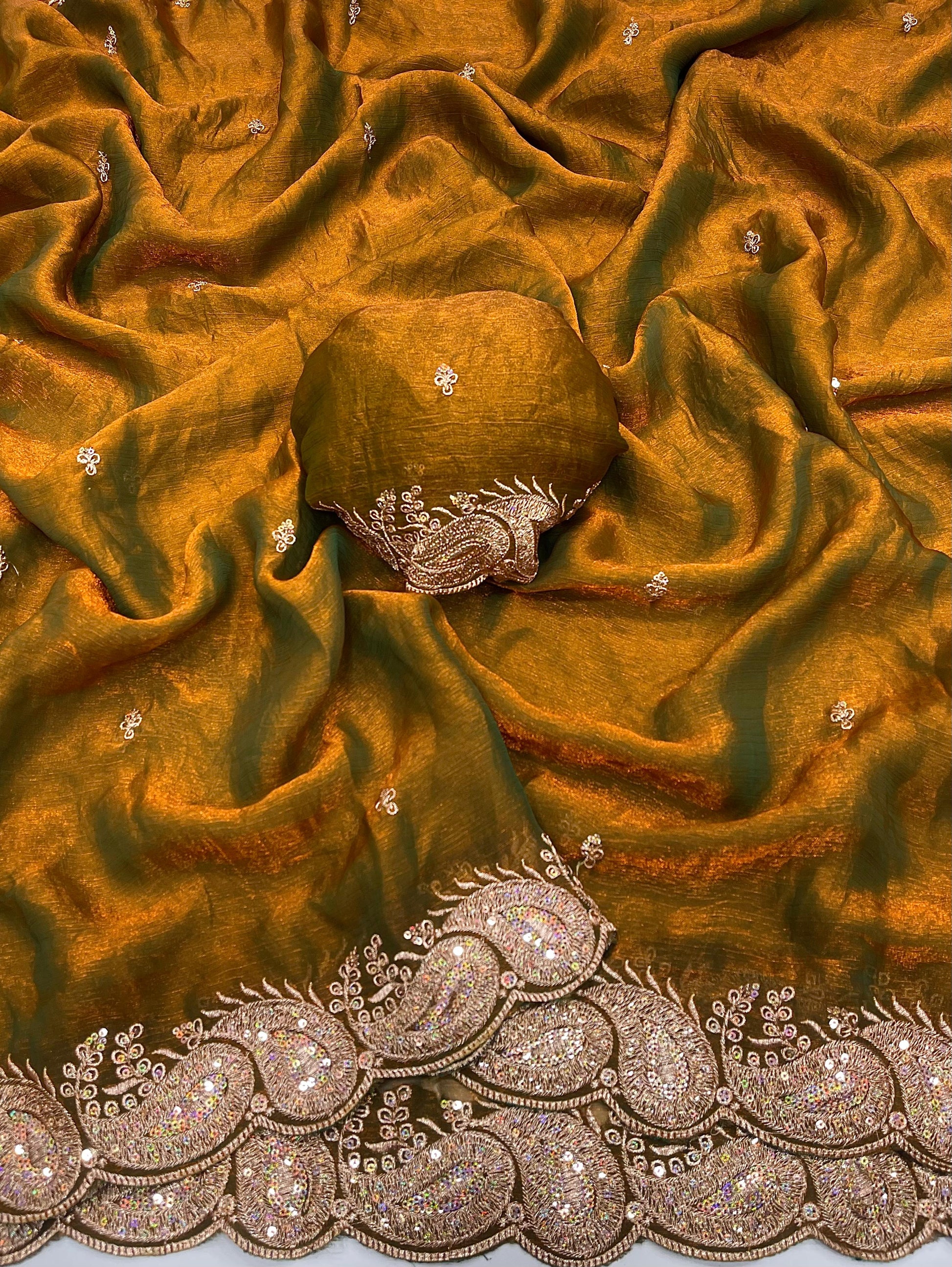 - This Shaded Fendy Chiffon saree features intricate multi-embroidery sequin work