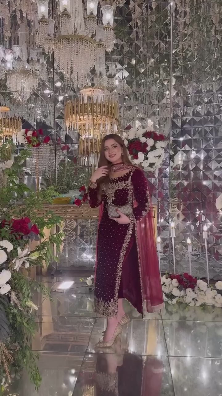 - Top Fabric :pure heavy viscose velvet with heavy embroidery sequence work neck pearl work with full sleeves